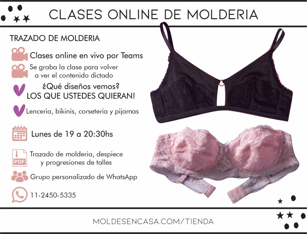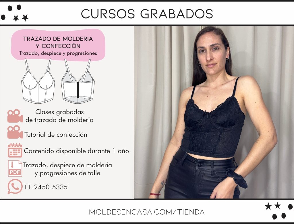 – Si además de la molderia querés aprender a confeccionar algunos modelos, también tenemos cursos grabados en nuestra tienda que incluyen videos de confección, por ejemplo: corpiño con arco y taza soft, corpiño con taza soft triángulo, bodys, bustier, modelos básicos de lencería y bikinis 👙