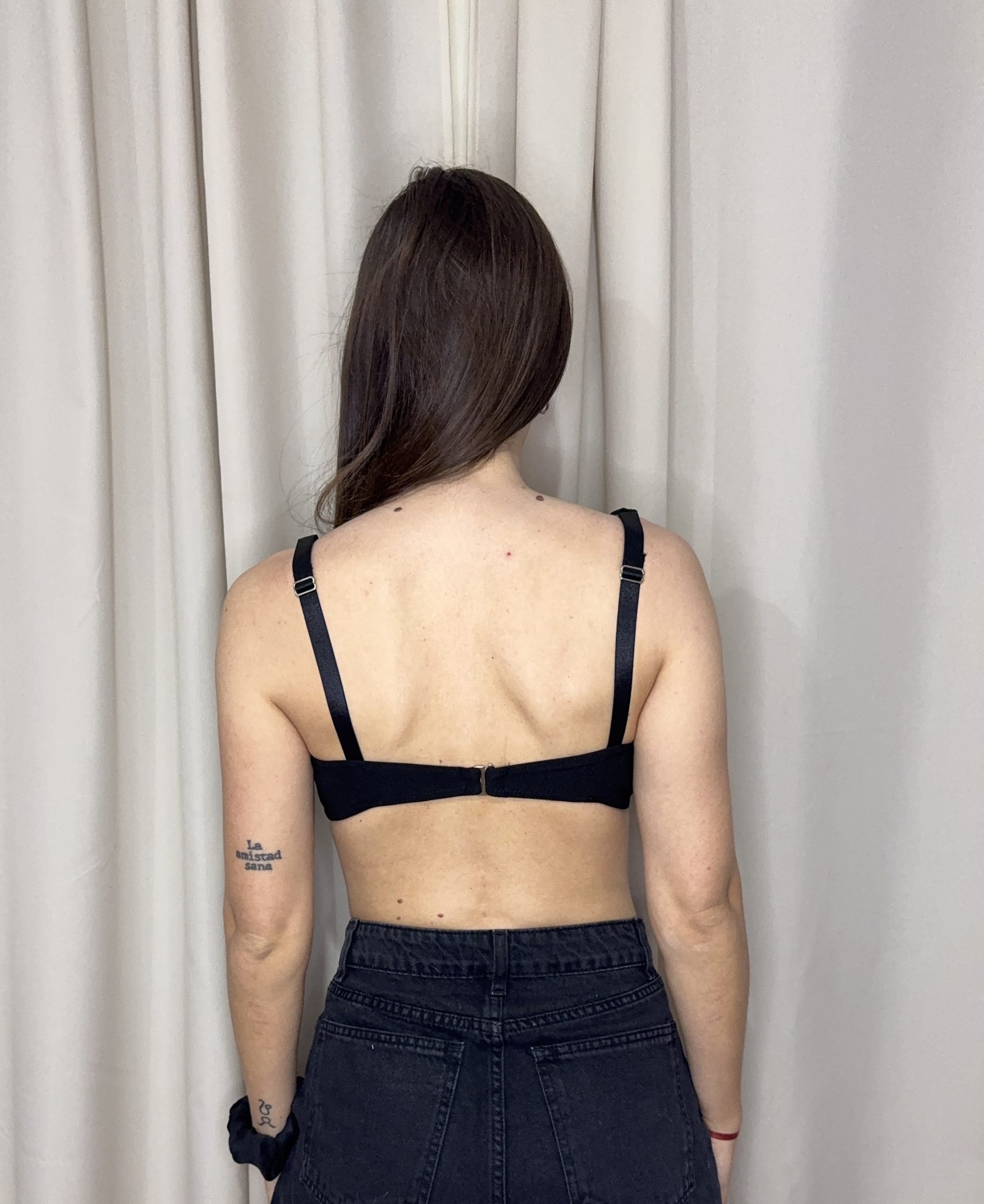 Corpiño con arco entero o alto, corte horizontal en sisa que divide la taza en tres piezas. Una de ellas es la taza lateral que llega hasta el hombro para unir con el bretel. Con una coleta tradicional para abrocharse con un gancho desmontable de 2 cm.