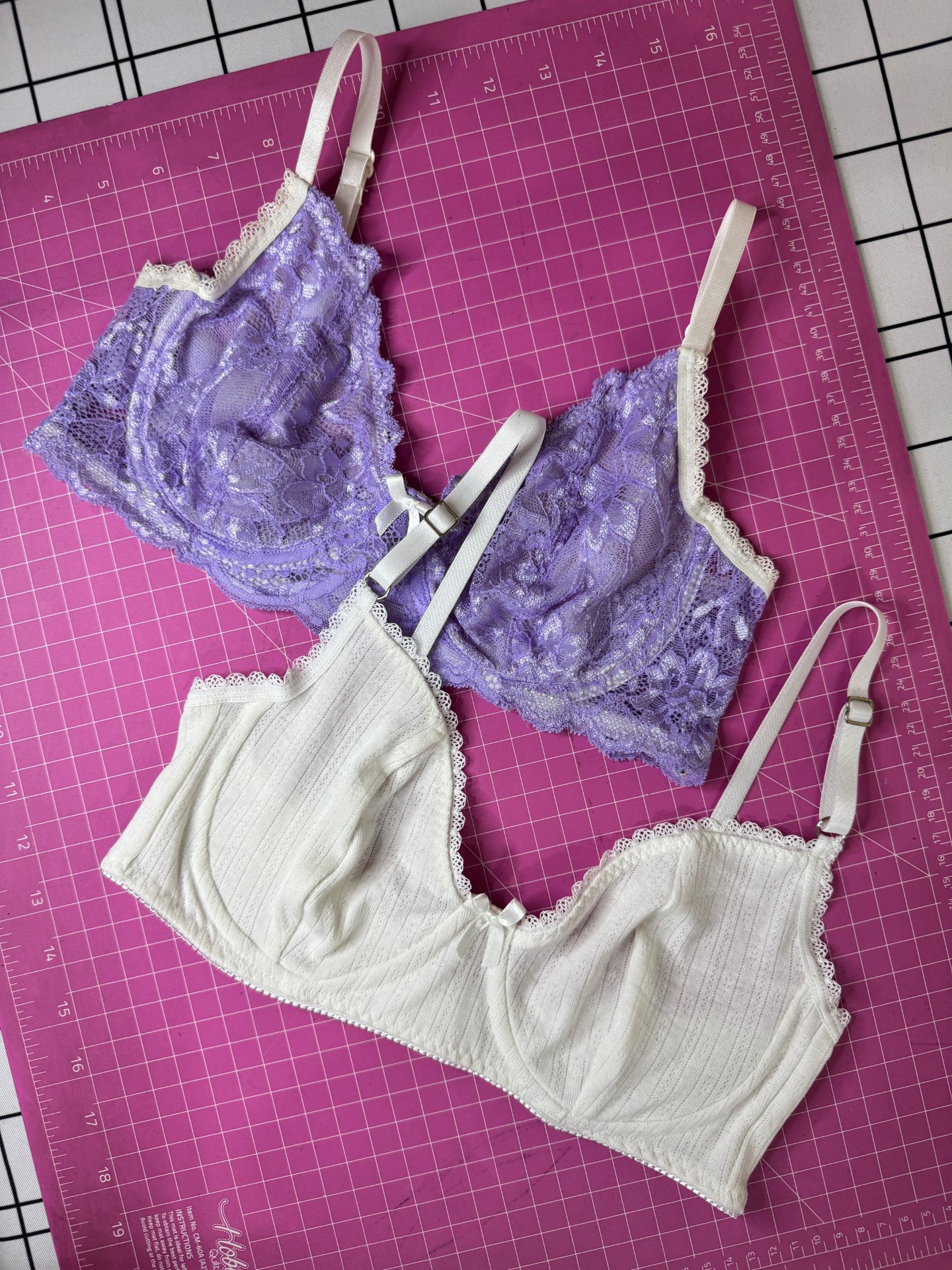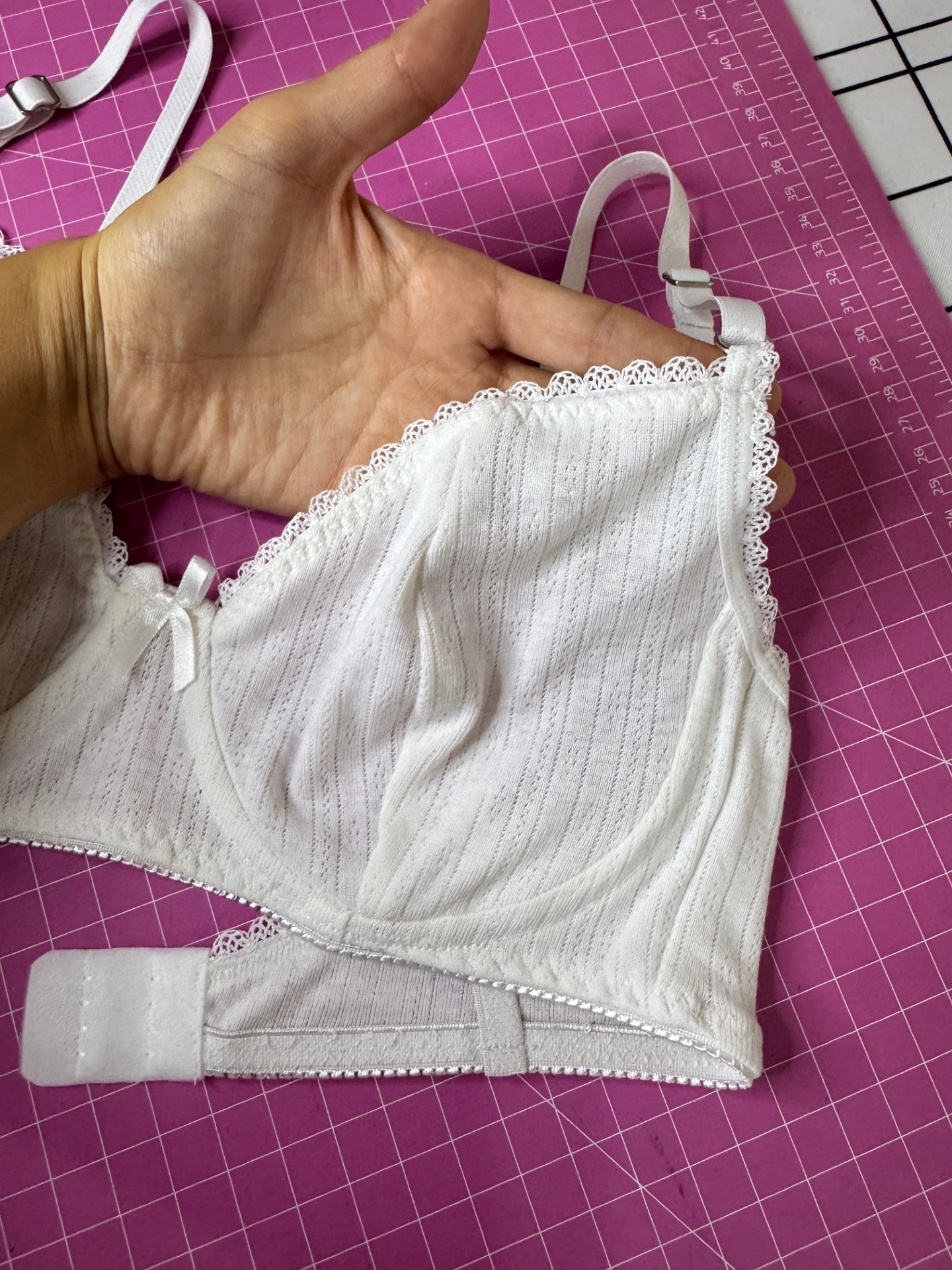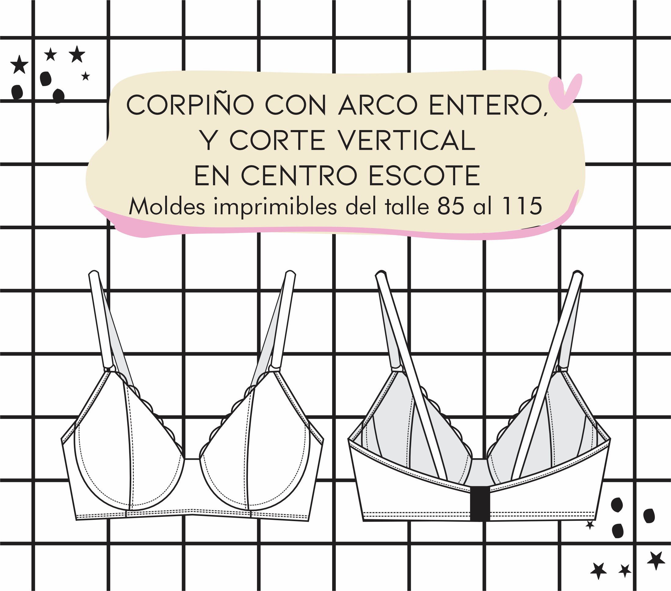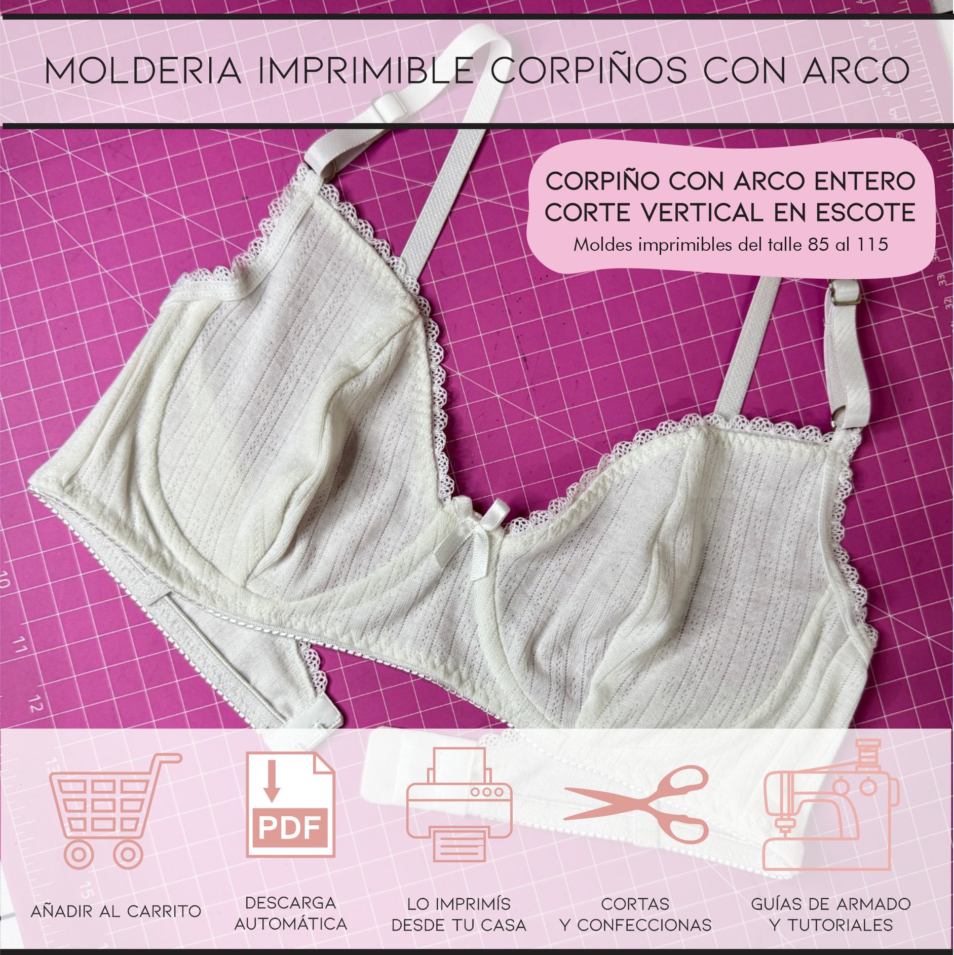 ✨ Tiene arco entero y corte vertical en las tazas que va hacia el escote (aproximadamente a la mitad del escote) para darle más capacidad al busto. Se puede confeccionar todo en puntilla o combinar diferentes telas.